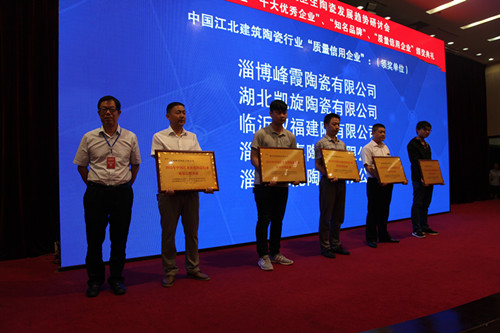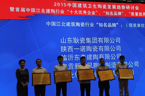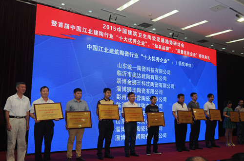 9月5日,2015中國(guó)建筑衛(wèi)生陶瓷發(fā)展趨勢(shì)研討會(huì)暨首屆中國(guó)江北建陶行業(yè)“十大優(yōu)秀企業(yè)”、“知名品牌”、“質(zhì)量信用企業(yè)”頒獎(jiǎng)典禮在淄博市淄川區(qū)人民禮堂召開。本次活動(dòng)由中國(guó)建筑衛(wèi)生陶瓷協(xié)會(huì)陶瓷板分會(huì)、國(guó)家陶瓷及衛(wèi)浴產(chǎn)品中小企業(yè)服務(wù)示范平臺(tái)主辦。中國(guó)建筑衛(wèi)生陶瓷協(xié)會(huì)常務(wù)副會(huì)長(zhǎng)繆斌,秘書長(zhǎng)呂琴,中共淄博市委常委市委政法委書記韓國(guó)祥,淄川區(qū)區(qū)委書記楊洪濤、區(qū)長(zhǎng)李新勝,咸陽(yáng)陶瓷研究設(shè)計(jì)院院長(zhǎng)梁振海及全國(guó)各地建陶產(chǎn)區(qū)企業(yè)代表、專家、學(xué)者和獲獎(jiǎng)單位代表300余人參加了本次研討會(huì)暨頒獎(jiǎng)典禮。 淄博市淄川區(qū)區(qū)委書記楊洪濤為大會(huì)致辭,中國(guó)建筑衛(wèi)生陶瓷協(xié)會(huì)副秘書長(zhǎng)、陶瓷板分會(huì)秘書長(zhǎng)徐波介紹了分會(huì)工作,與會(huì)專家、企業(yè)代表進(jìn)行了交流互動(dòng)。 會(huì)上對(duì)2015首屆中國(guó)江北建筑陶瓷行業(yè)“十大優(yōu)秀企業(yè)”、“知名品牌”、“質(zhì)量信用企業(yè)”進(jìn)行了表彰和頒獎(jiǎng)。山東統(tǒng)一陶瓷科技有限公司、臨沂市奧達(dá)建陶有限公司等10家企業(yè)被評(píng)為2015首屆中國(guó)江北建筑陶瓷行業(yè)“十大優(yōu)秀企業(yè)”,“瓦倫蒂諾”、“米羅印象”等20個(gè)陶瓷品牌被評(píng)為2015首屆中國(guó)江北建筑陶瓷行業(yè)“知名品牌”,淄博獅王陶瓷有限公司、沈陽(yáng)新王者陶瓷有限公司等20家企業(yè)被評(píng)為2015首屆中國(guó)江北建筑陶瓷行業(yè)“質(zhì)量信用企業(yè)”。 (獲獎(jiǎng)企業(yè)名單見(jiàn)附件)